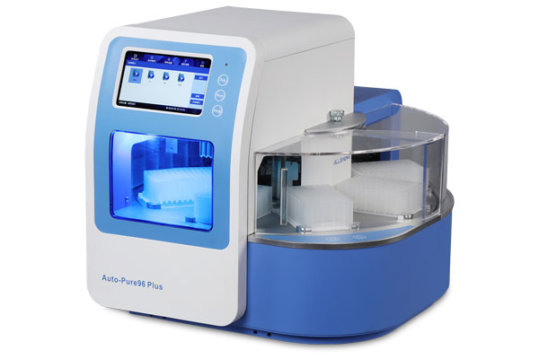Auto-Pure96/Auto-Pure48/Auto-Pure24 全自动核酸提取仪采用磁珠分离技术,利用96×2.2ml深孔板、96磁棒套(1,000μl反应体系);48×5ml深孔板、48磁棒套(5,000μl反应体系); 24×14ml深孔板、24磁棒套(10,000μl反应体系)搭配不同种类的磁珠法核酸提取试剂盒,可一次同时操作1-96个样本或1-48个样本或1-24个样本,仅需30~60分钟就可快速提取样本中的DNA和RNA。