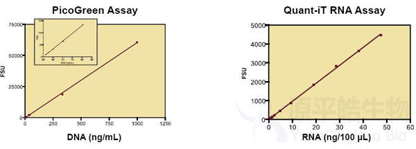 使用荧光检测模块, Modulus™ 能够完成高灵敏度的DNA/RNA定量检测, 可应用PicoGreen或Hoechst染料定量检测DNA, 应用RiboGreen或Quant-iT RNA染料定量检测RNA. 使用PicoGreen染料, 在微量检测皿100ul检测体积下, 可检测低至4.5pg的dsDNA.