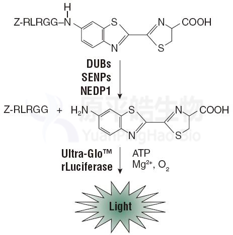 将DUBs的酶促反应与荧光素酶反应相偶联,可以通过荧光素酶的发光反应来检测DUBs的活性,从而进行DUBs酶活测定或DUBs抑制剂筛选。
