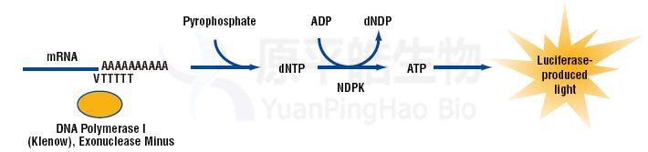 mRNA 的浓度和质量是微阵列分析、cDNA文库构建、PAGE等实验中重要的参数。传统的分光光度计方法无法区分总RNA中的rRNA和tRNA污染。基于DNA聚合酶I(Klenow; Exonuclease minus)焦磷酸化活性而设计的一种新型检测方法提供了灵敏而特异的检测Poly(A) mRNA的可能性。锚定寡核苷酸引物 oligo(dT)与poly(A) mRNA 杂交,伴随着焦磷酸化和转磷酸化反应,反应产物ATP与存在的poly(A)尾成正比。再通过对ATP浓度的检测确定Poly(A) mRNA 的浓度。