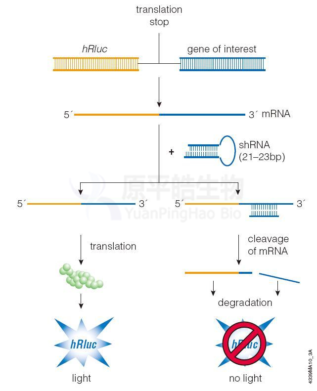 PsiCHECK载体将RNAi与荧光素酶发光相偶联:当RNAi有效时,转录的荧光素酶RNA将被降解,无发光反应;当RNAi无效时,转录的荧光素酶RNA将翻译为荧光素酶,并参与发光反应。通过检测发光即可反应RNAi的效果。