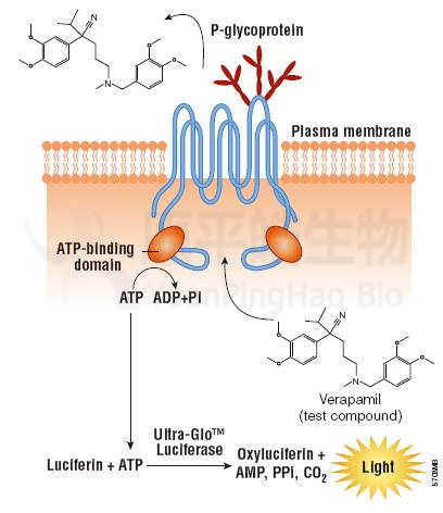 将P-gp的酶促反应与荧光素酶的发光反应相偶联,可以通过发光检测来确定P-gp的活性,从而筛选出影响P-gp活性的药物或化合物。